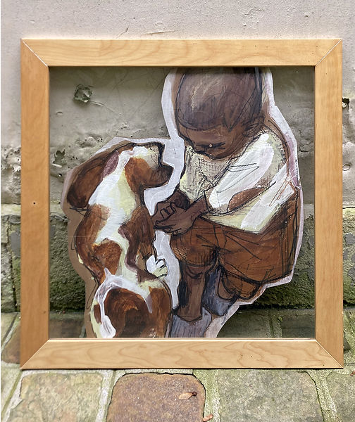 Encre de Chine, brou de noix, acrylique et craie sur carton, sous vitre de récupération délicieusement tachetée par endroits